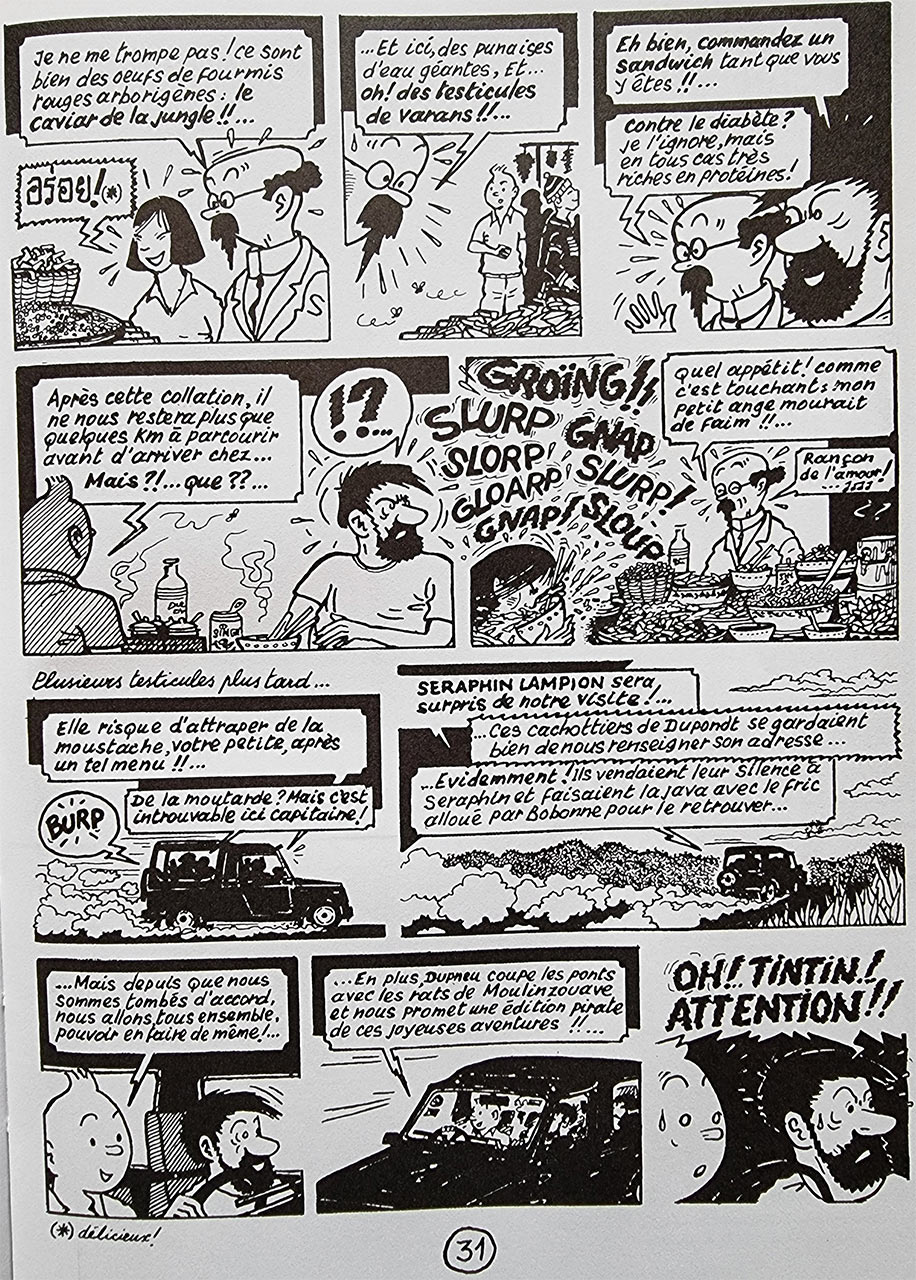 Alors que la bande de joyeux lurons s’enregistre dans leur hôtel de Bangkok, ils sont repérés par André Dupneu, un représentant de la société Moulinzouave qui détient les droits de la franchise Tintin. Il appelle son siège social et on lui dit qu’il doit les empêcher de se lancer dans d’autres aventures qui pourraient être utilisées dans un livre non contrôlé par Moulinzouave.