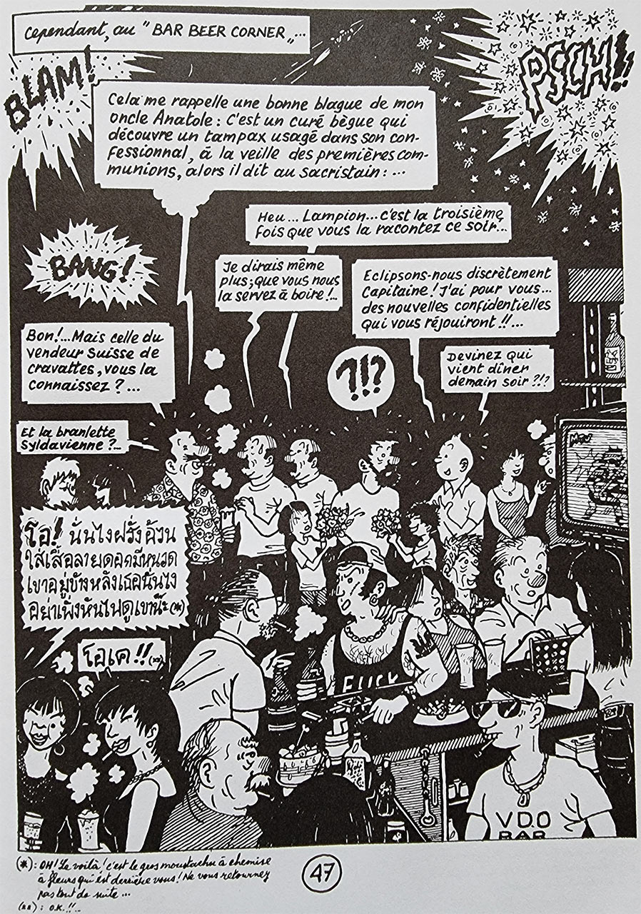 Tintin, Haddock et Tryphon Tournesol se rendent dans le quartier rouge, où ils rencontrent le général Alcazar, aujourd’hui propriétaire d’un bar thaïlandais après avoir été déposé par le général Tapioca. Alcazar leur dit qu’il a vu Séraphin Lampion dans son bar, mais qu’il est allé au nord de Chiang Mai avec un kathoey (transsexuel). Tournesol et Haddock ramassent tous les deux des prostituées dans le bar, mais Tintin préfère plutôt la compagnie d’un jeune garçon (c’est une référence aux questions des fans concernant la sexualité de Tintin dans les BD originales).